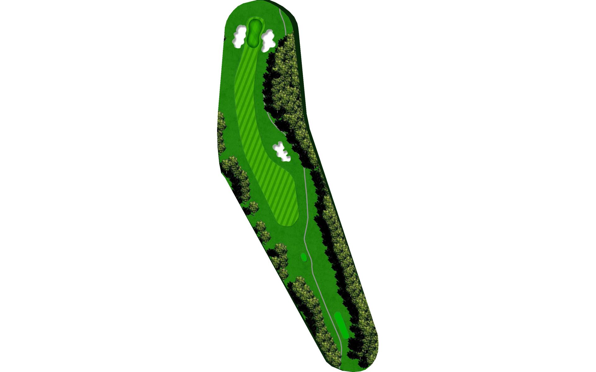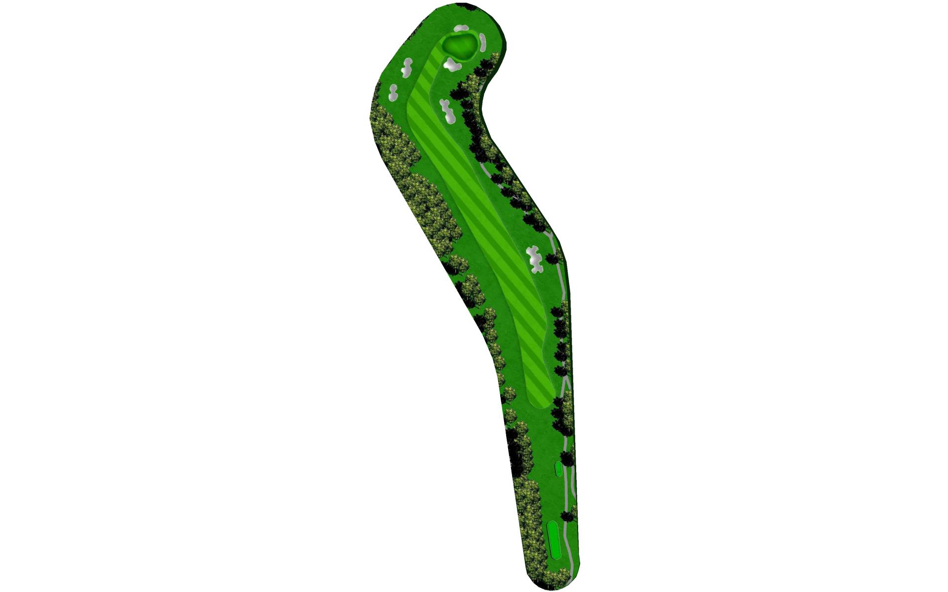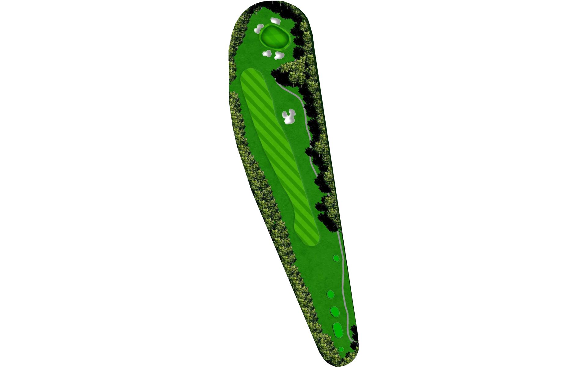 Slight dogleg right going uphill. Large green with multiple slopes and tiers.
