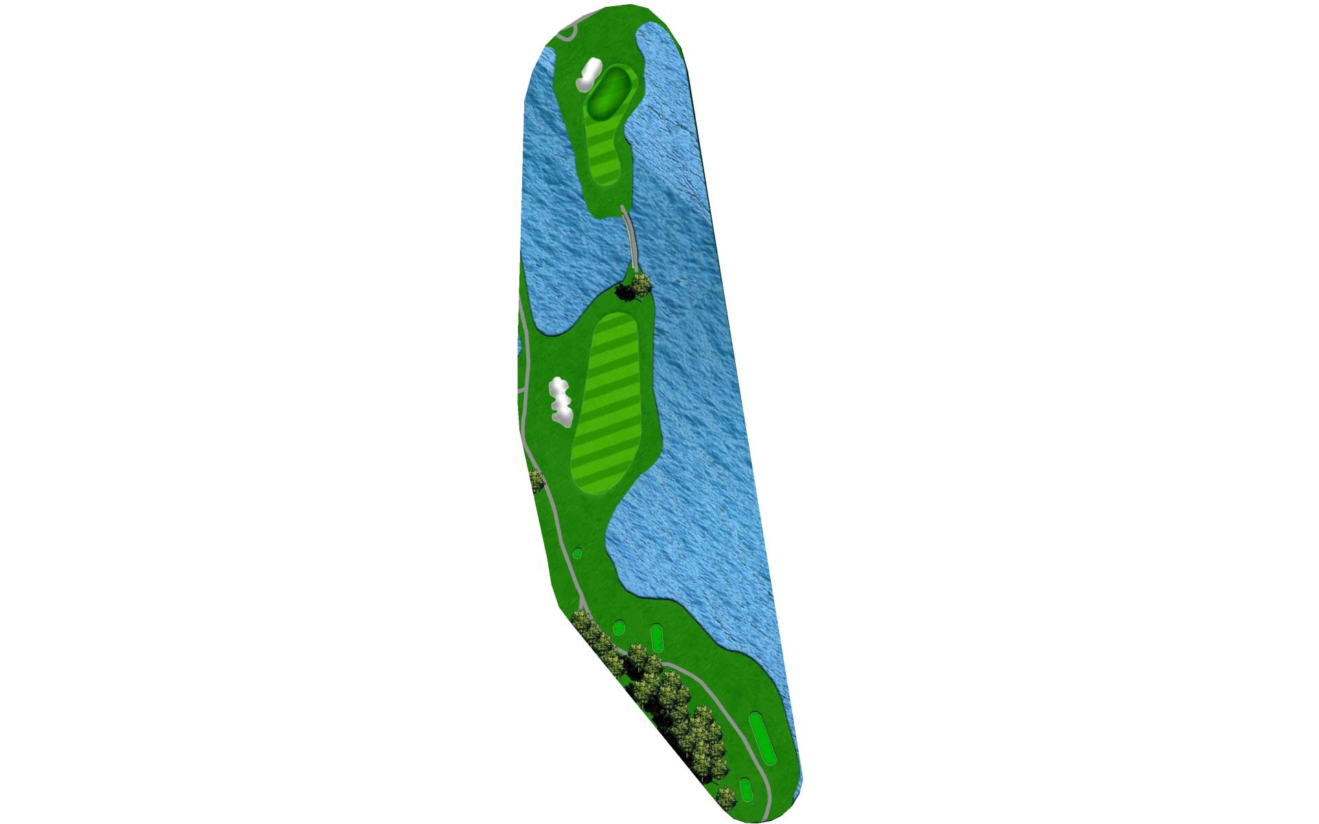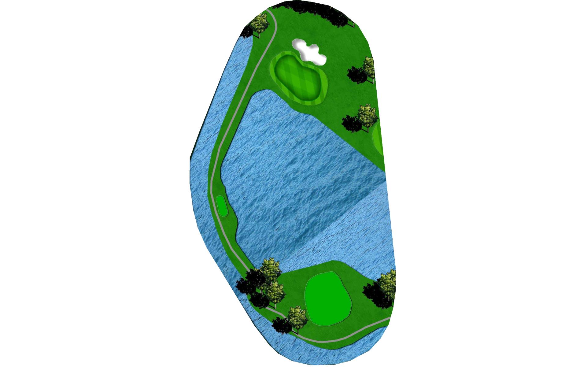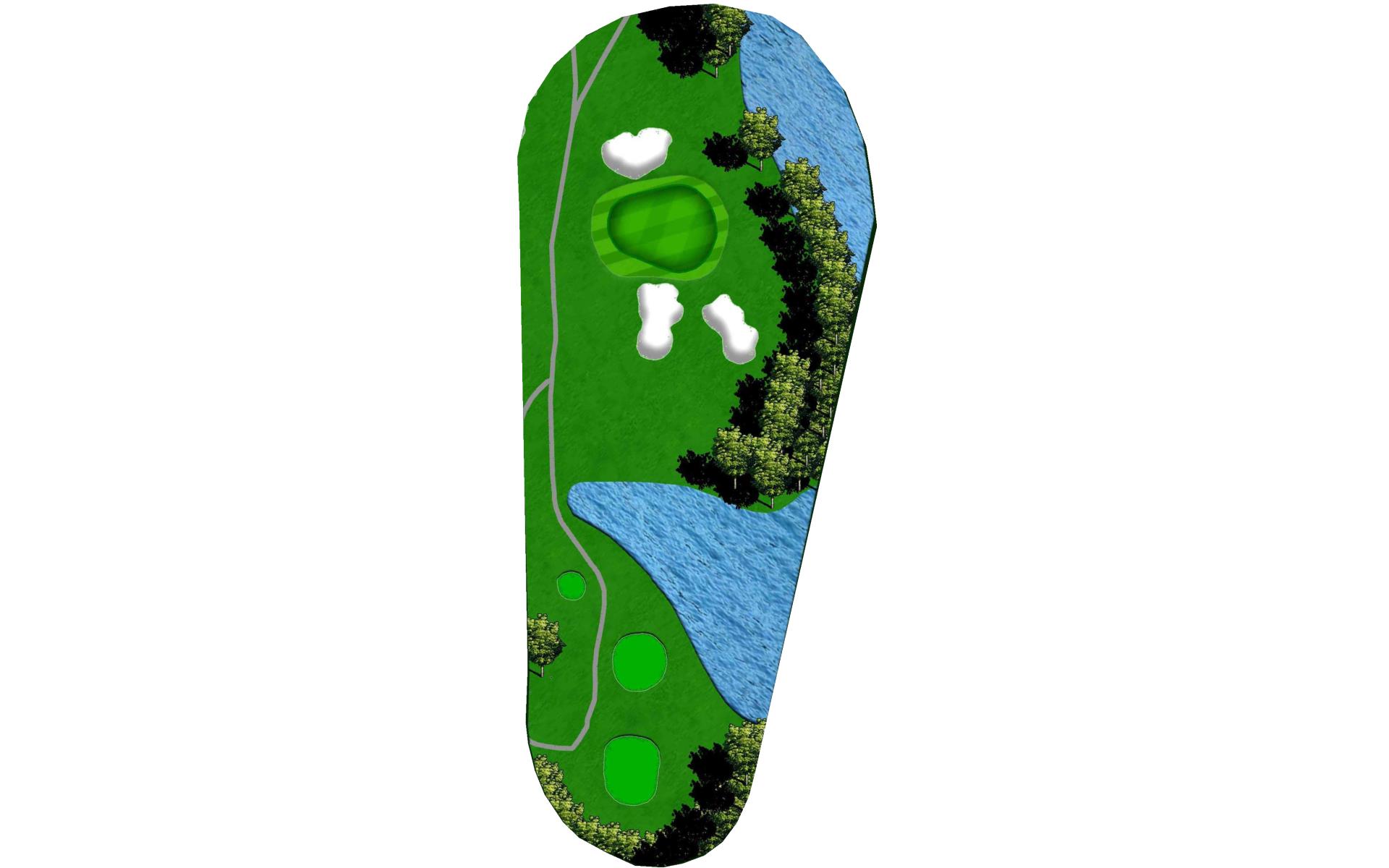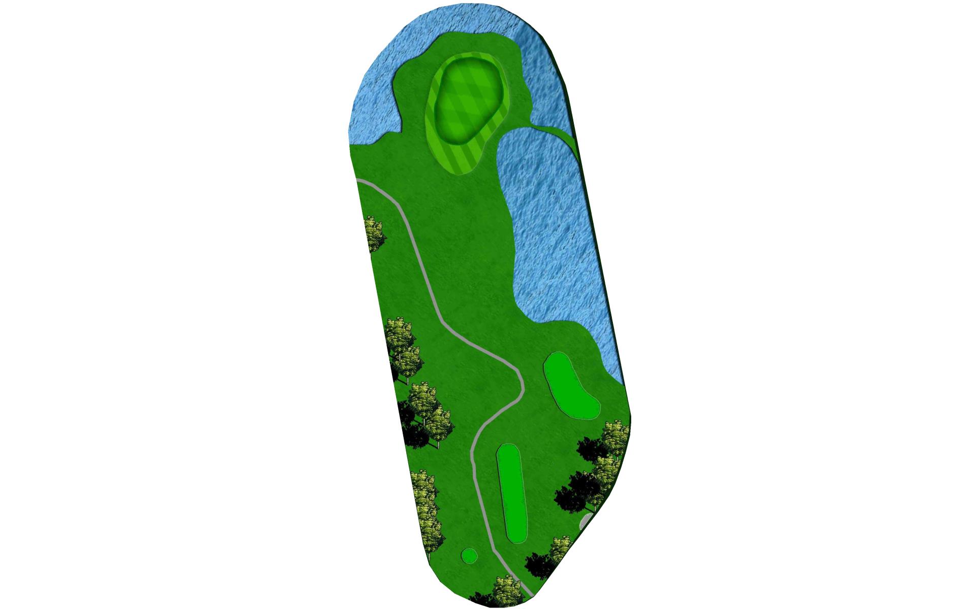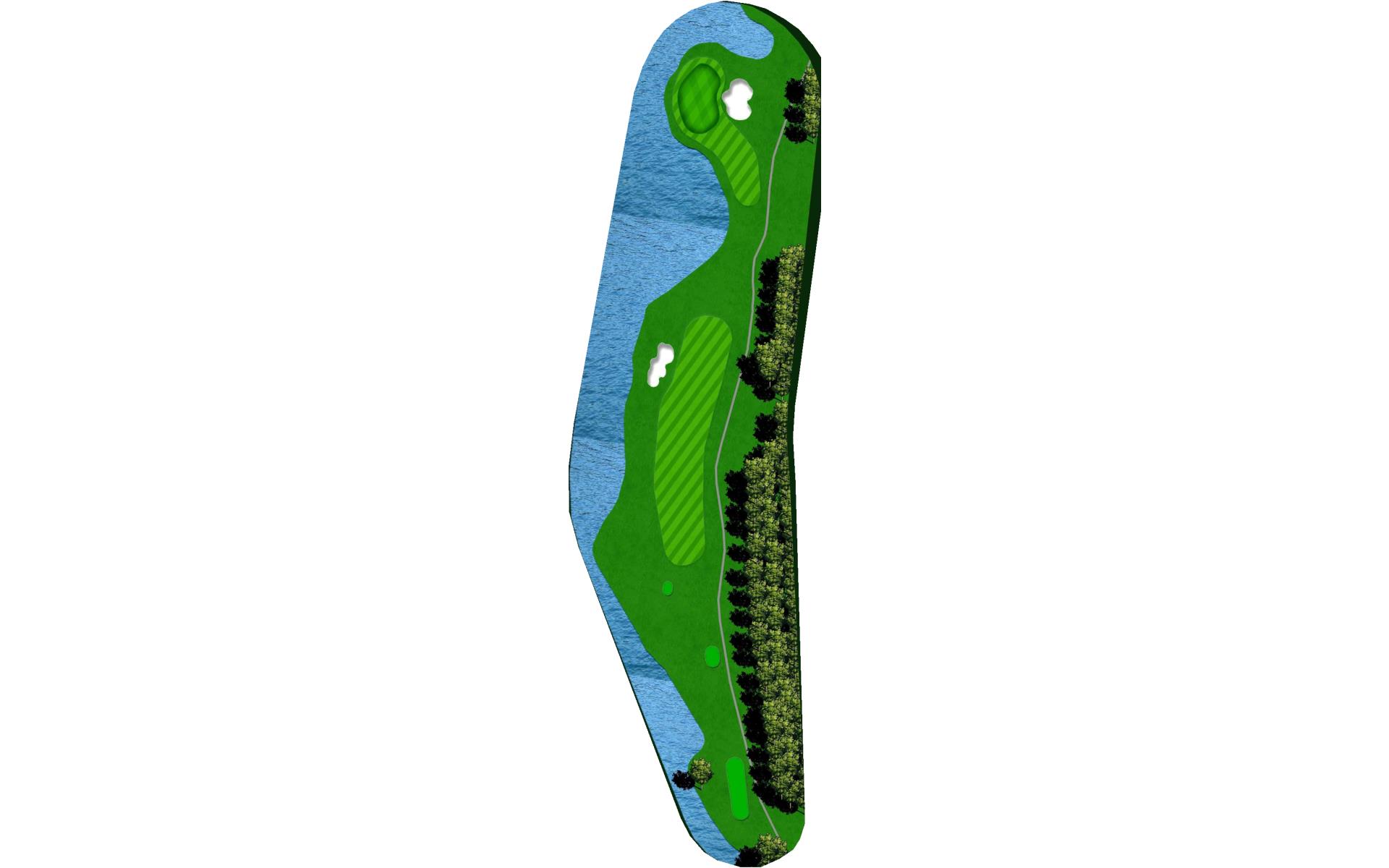 Multi-tiered green sloping from back to front. The left side of the green has a dangerous slope leading to the water's edge.