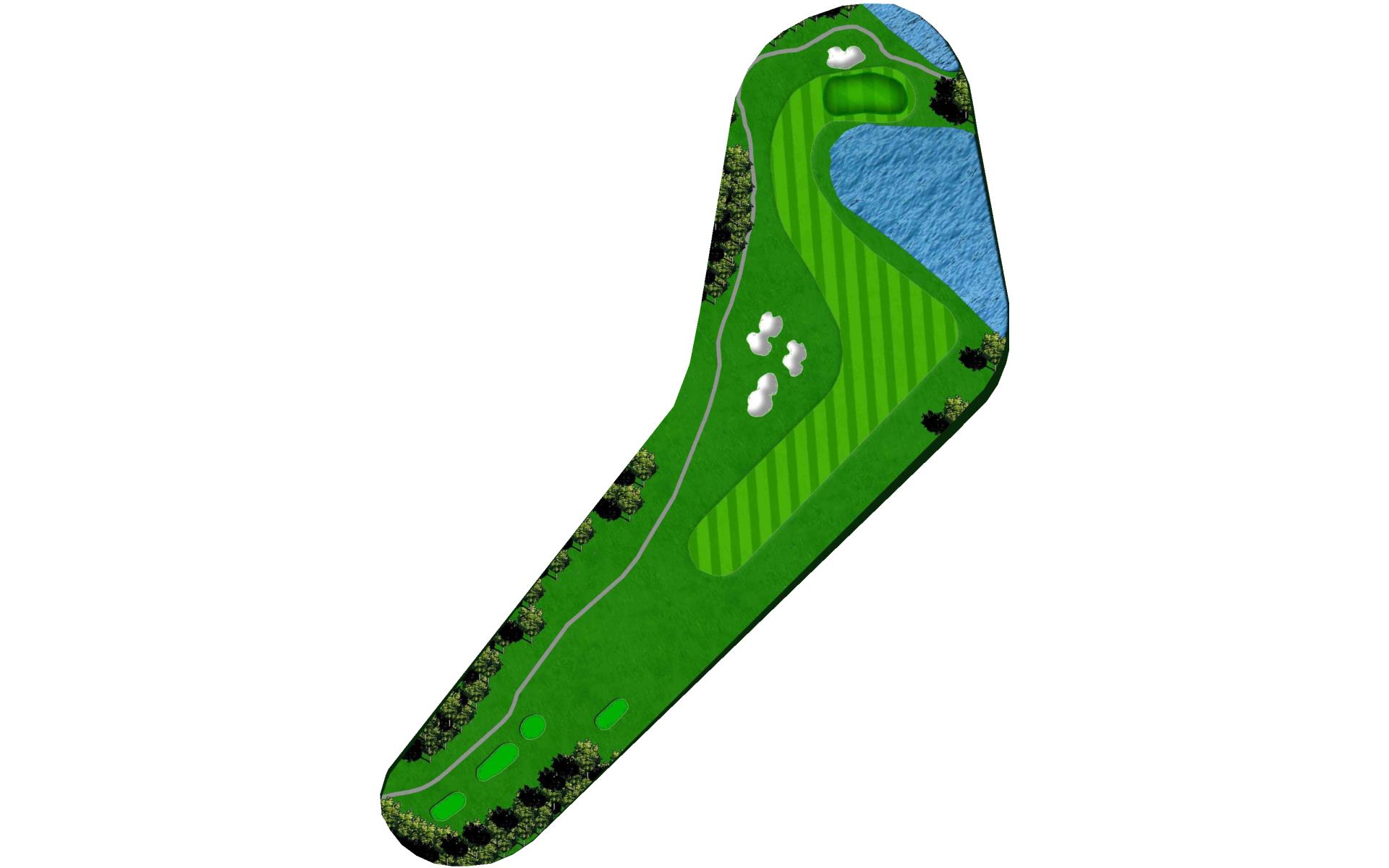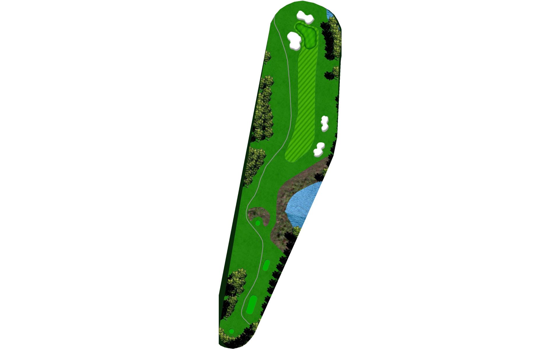 Downhill dogleg left. The fairway makes a 90-degree turn left at about 90 yards out from the green with water. The green slopes strongly from back to front with a dangerous pond on the very front edge of the green.